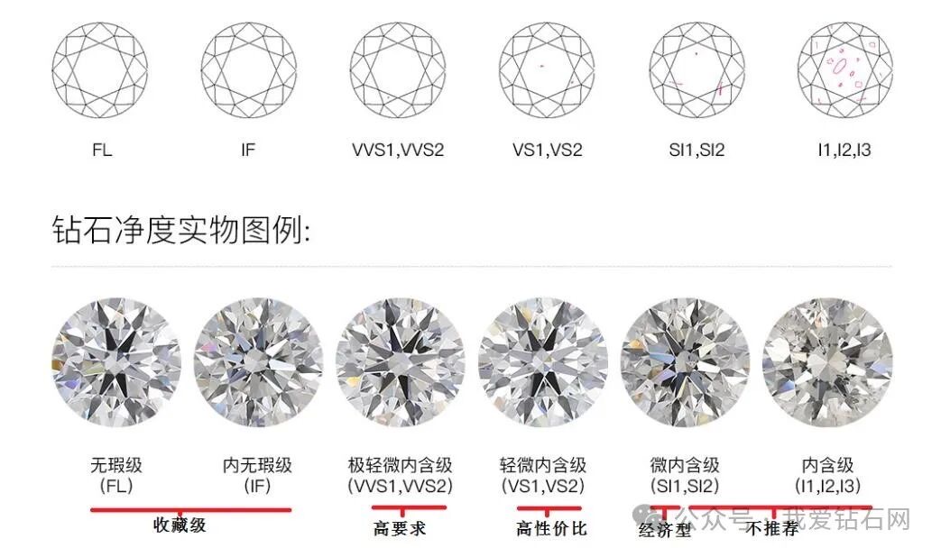 钻石净度指内部杂质含量,等级从高到低为 FL(无瑕)、IF(内无瑕)、VVS1(极轻微瑕)、VVS2(极轻微瑕)、VS1(轻微瑕)、VS2(轻微瑕)、SI1(微瑕)、SI2(微瑕)等。