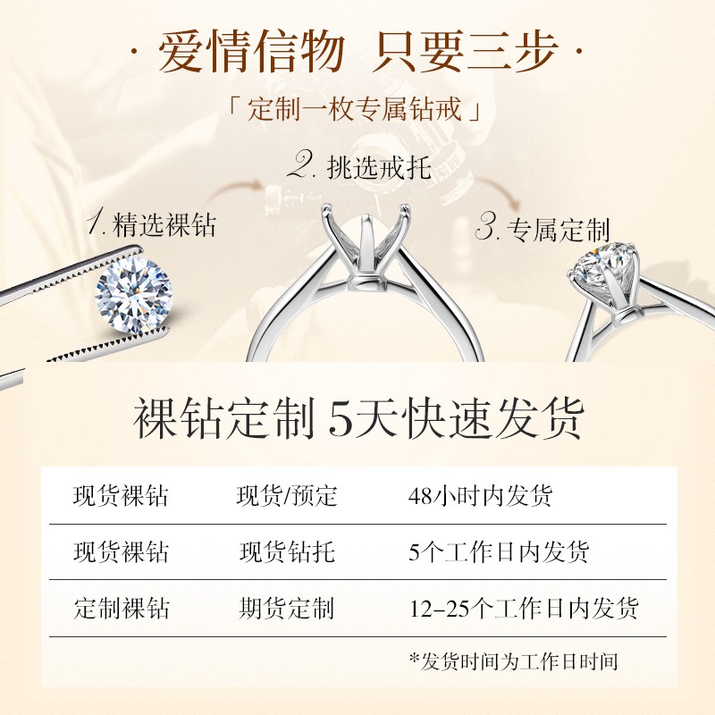 配送:全国包邮(港澳台除外);现货预计3-5个工作日到货,购买前,钻戒类指圈号请咨询客服或备注留言,定制发货时间据款式而定