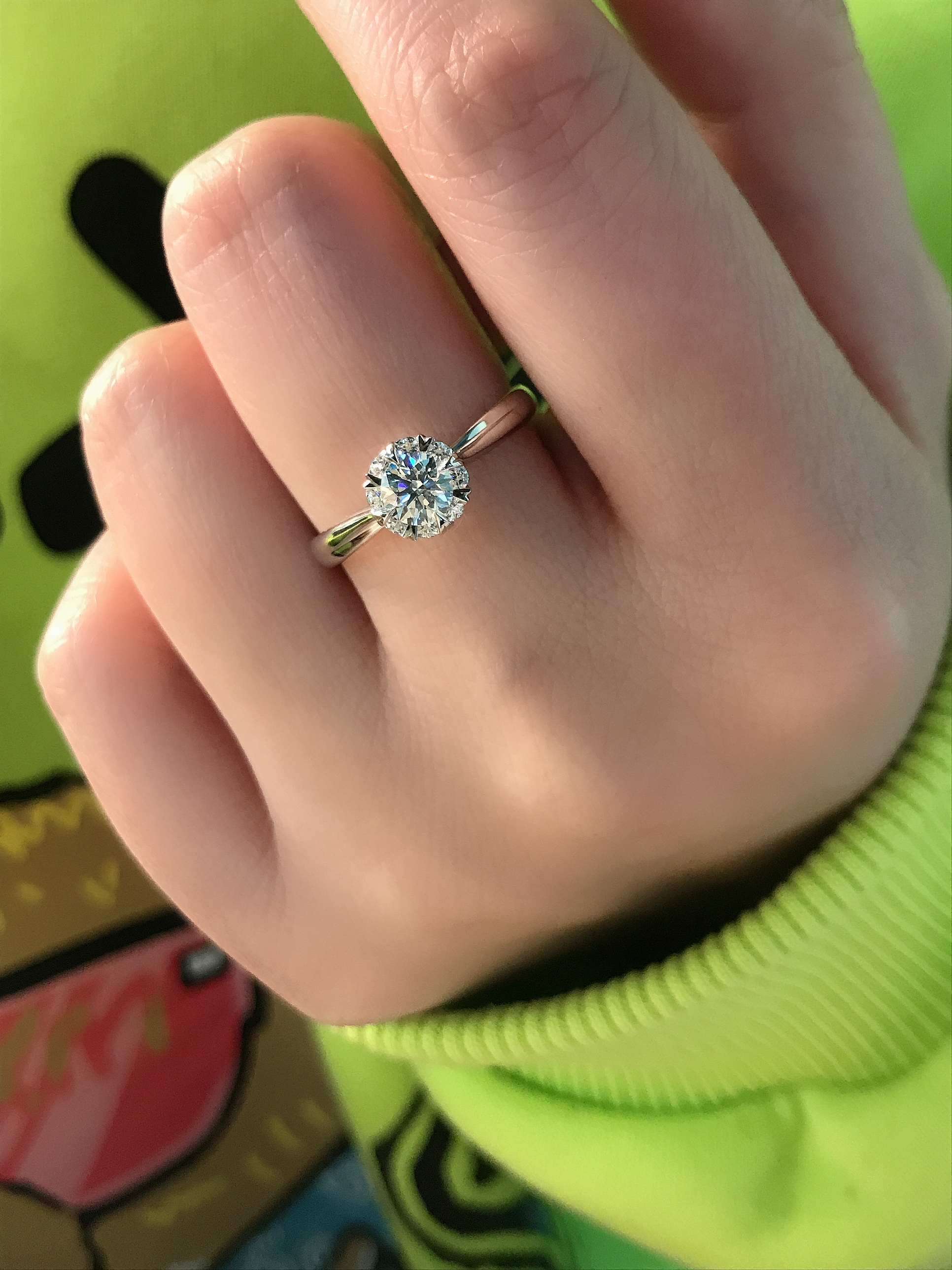 商品点评:戒指收到了。之前在我爱钻石网购买的2克拉裸钻,一直没做托,这次做了托,收到很满意。就是喜欢黄黄的感觉。但是黄钻又太黄了,所以特意让客服推荐了M色的,关键价格还很合适,赚到了
