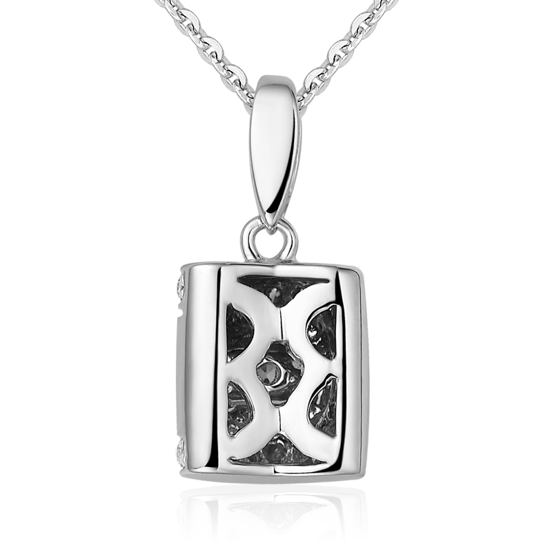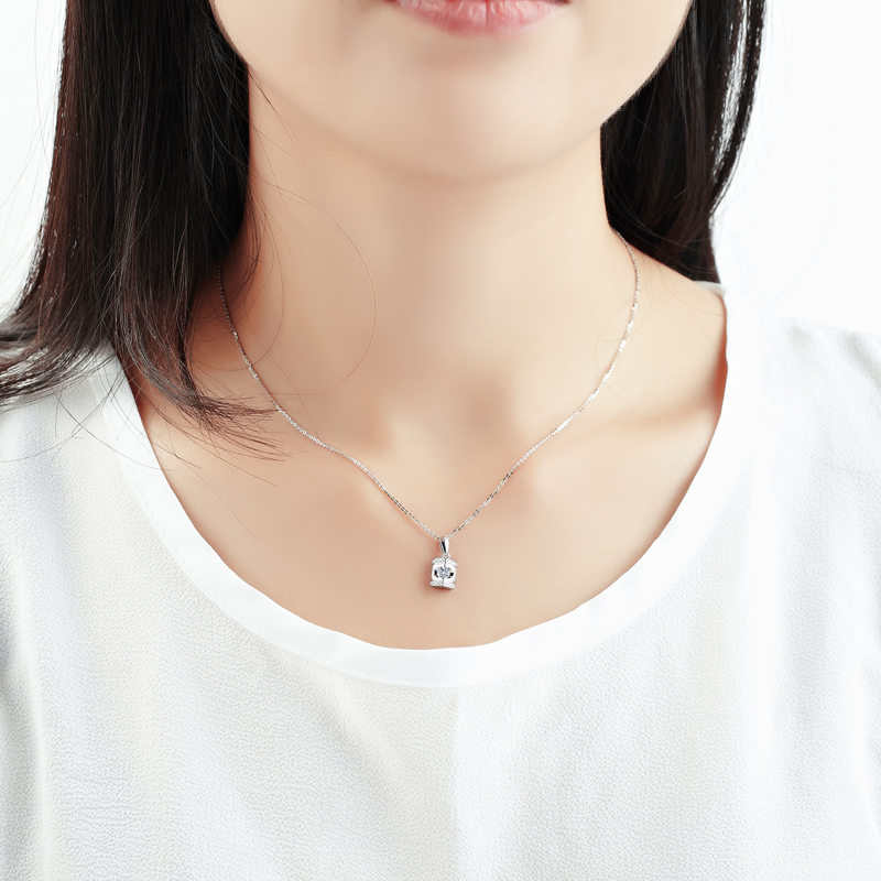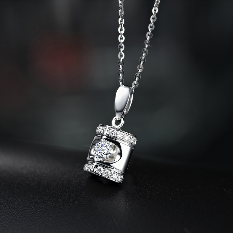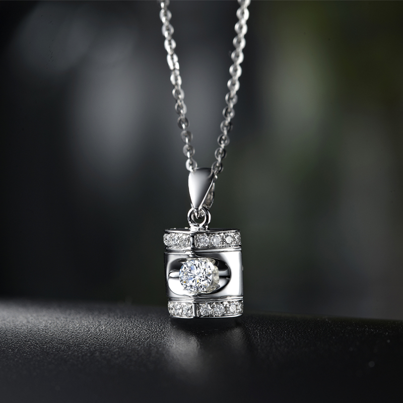 这款“典雅”,采用了吊坠设计中不太常见的夹镶工艺,让主钻更加焕发出璀璨的火彩,上下两排小钻精致镶嵌在主钻周围,熠熠闪耀,巧妙的衬托出了女性优雅婉约的气质。