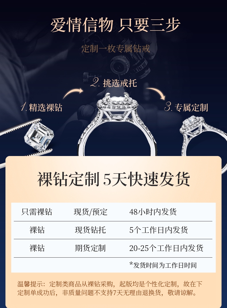 配送:全国包邮(港澳台除外);现货预计3-5个工作日到货,购买前,钻戒类指圈号请咨询客服或备注留言,定制发货时间据款式而定