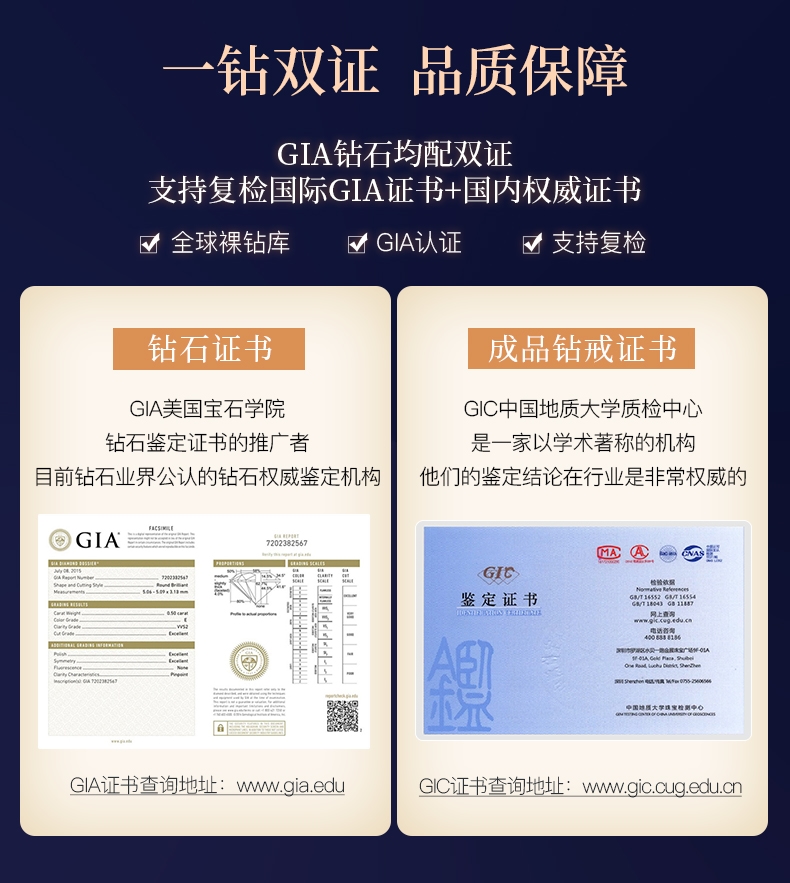 GIA国际钻石证书与国检证书,双证质保,品质无忧;