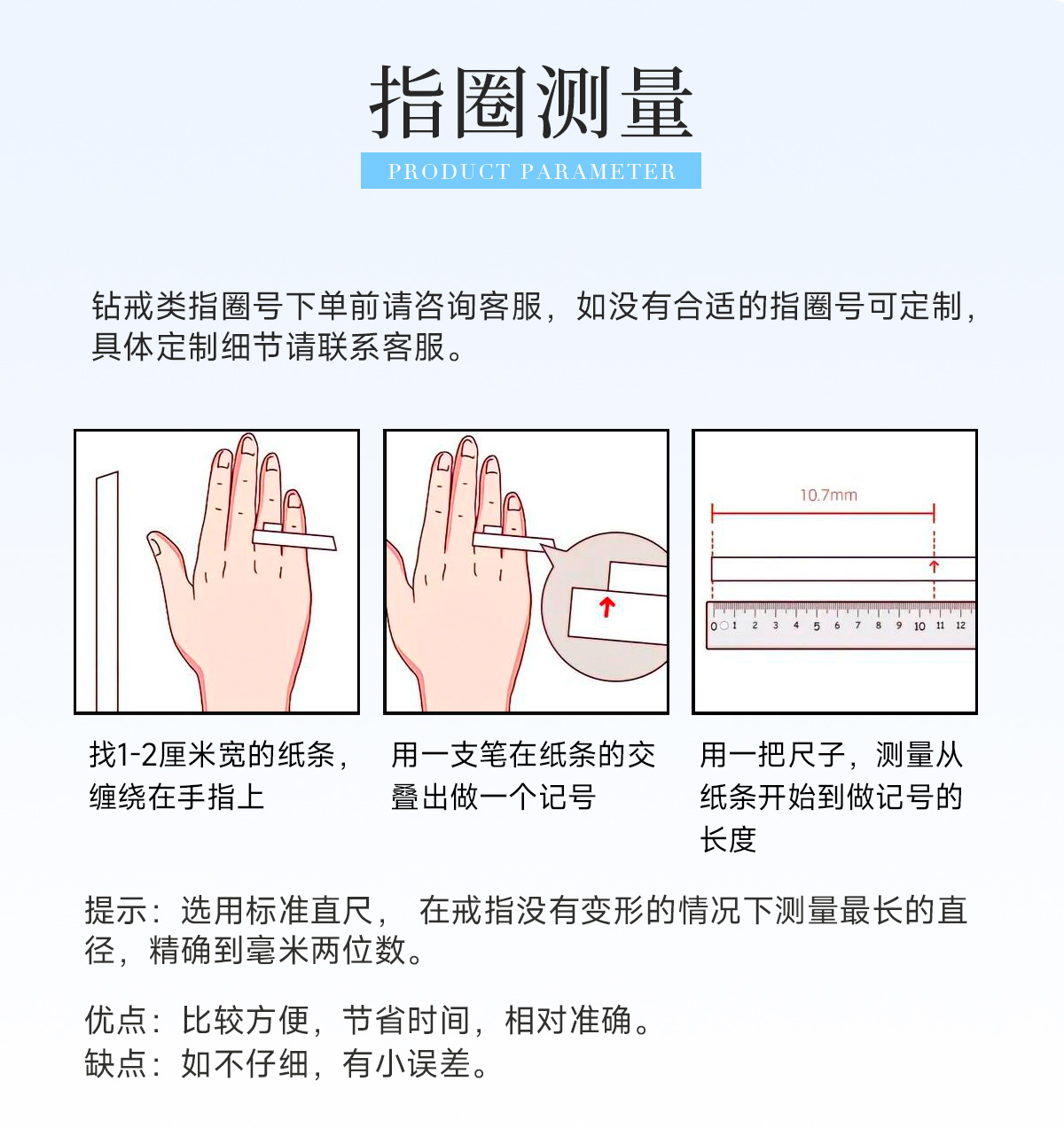 若家中有现成戴的正好的戒指,请用直尺测出戒指内圈直径,对应下方尺寸表得出指圈号。